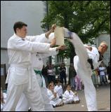 Hier werden der Reifegrad, die Präzision und die Geschindigkeit einer Technik in "Anwendung" erprobt. Sieht spektakulär aus, hat im Training aber nur geringe praktische Bedeutung: das Zerschlagen von Brettern, Ziegeln und Steinen. Diese Fähigkeit ergibt sich aus dem konsequenten Training von Kraft, Schnelligkeit und Genauigkeit einer Technik. Der Bruchtest erfordert eine präzise Technikausführung mit exaktem Brennpunkt, Kraft und Schnelligkeit. Nur eine korrekt ausgeführte Technik bringt das Brett zum Brechen.